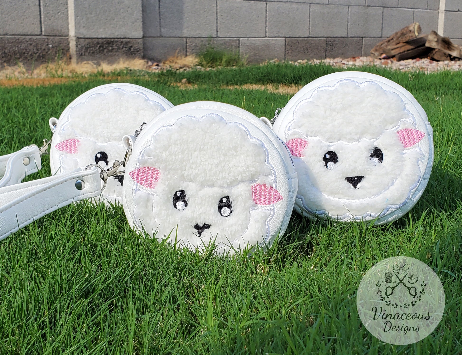 The front of the wristlet is an embroidered sheep applique. Exterior is made of vinyl with an interior of cotton lining.